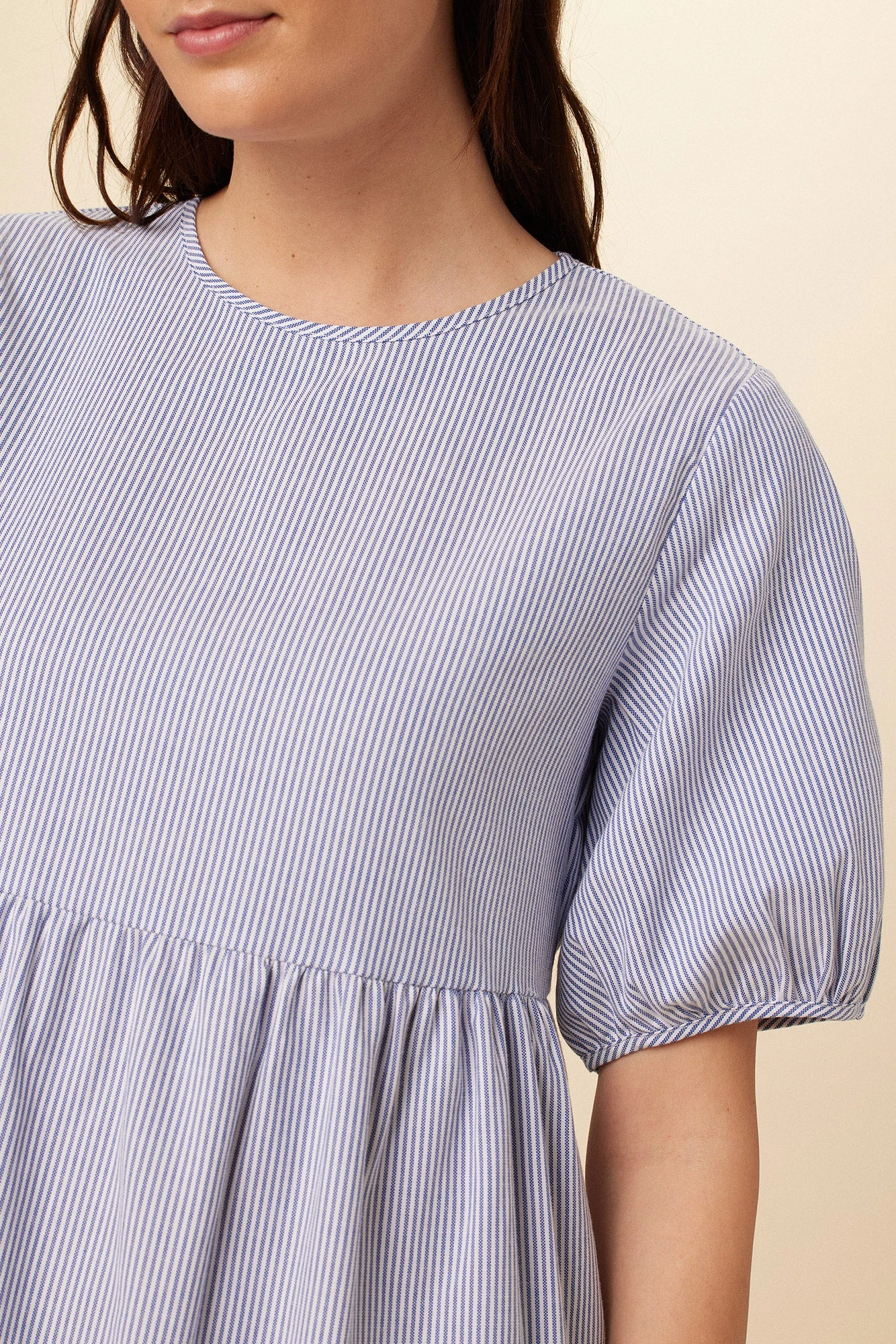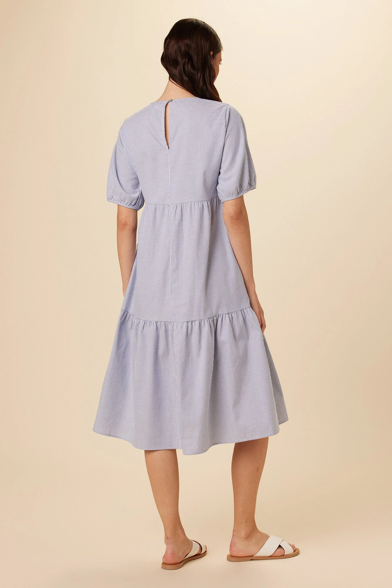 Relaxed fit midi dress featuring short puff sleeves, an empire seam, tiered layers and a loop and button closure. Made from upcycled fabric to stay true to our commitment to repurpose and give new life to leftover materials.