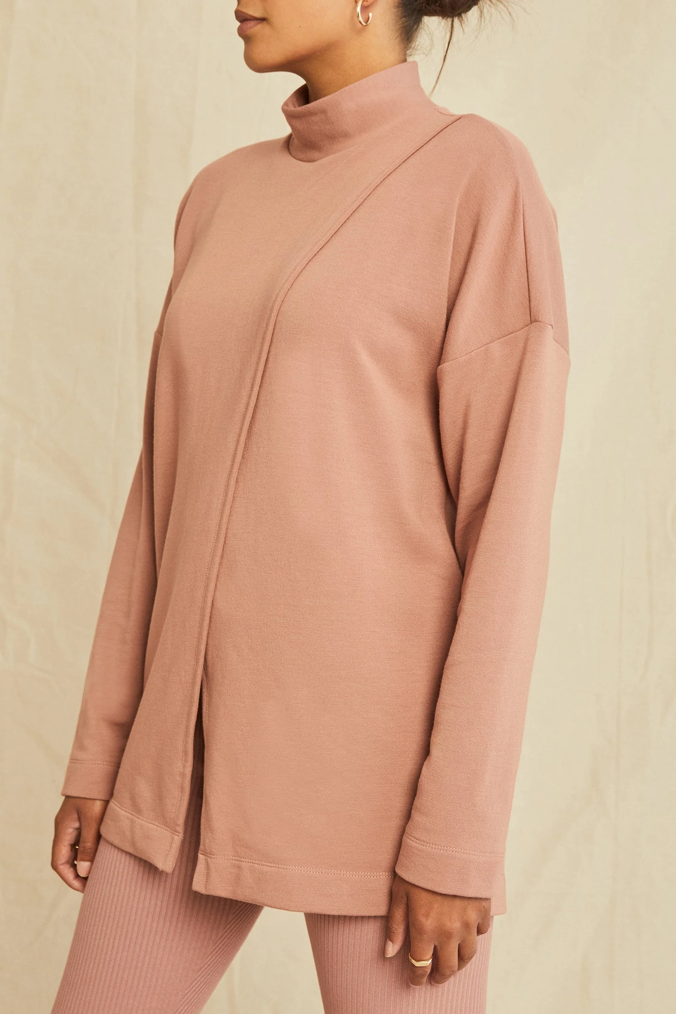 - Long-sleeve tunic length turtleneck with drop shoulder