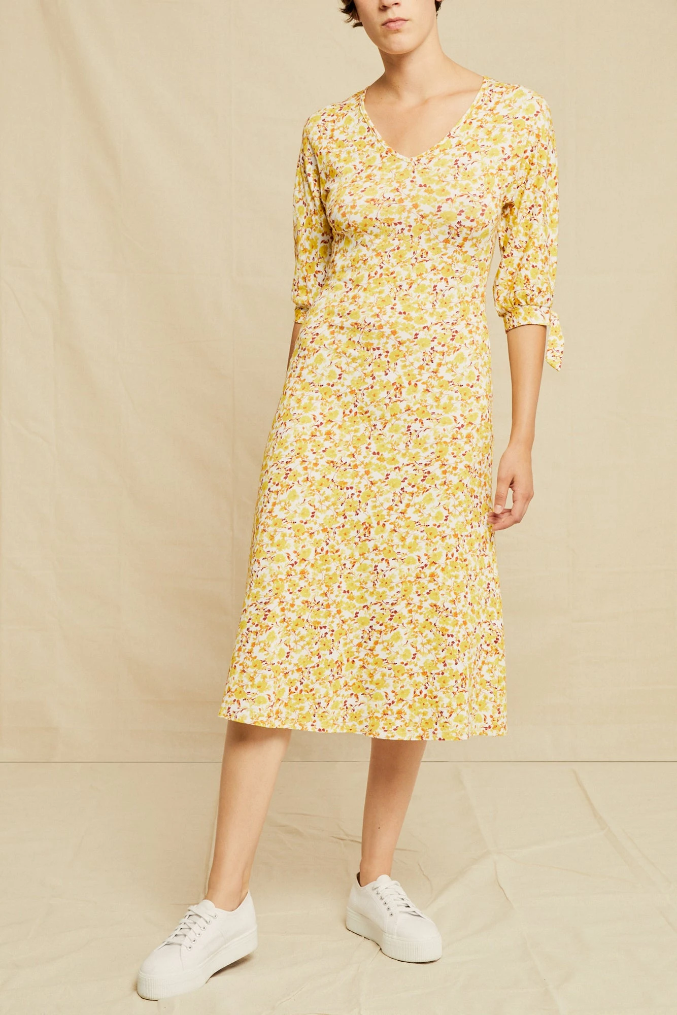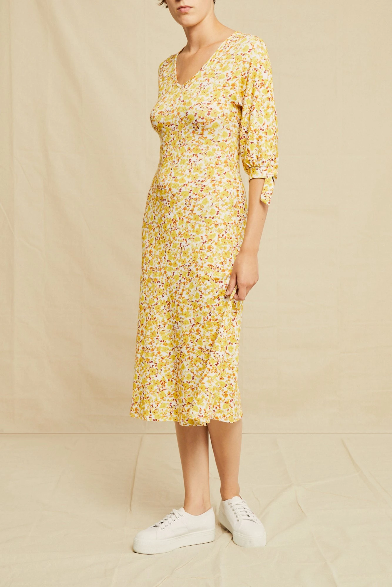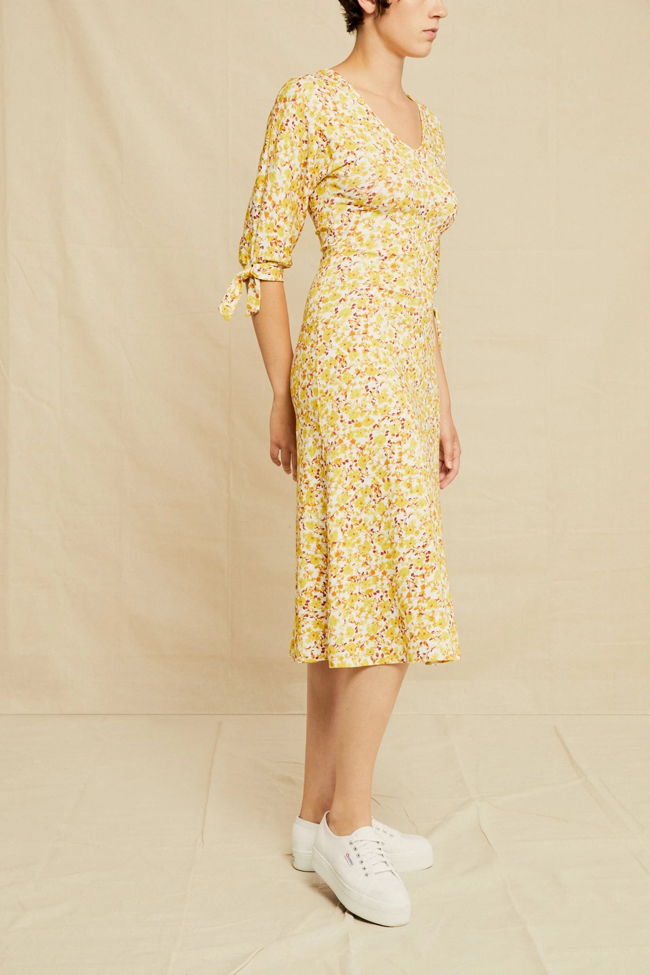 Made in our luxe Reverie Knit, this midi pull-on dress is soft, stretchy, and can easily be dressed up or down. This silhouette fits like an A-line and has a shaped empire waist and a puff dolman sleeve with a tie cuff.