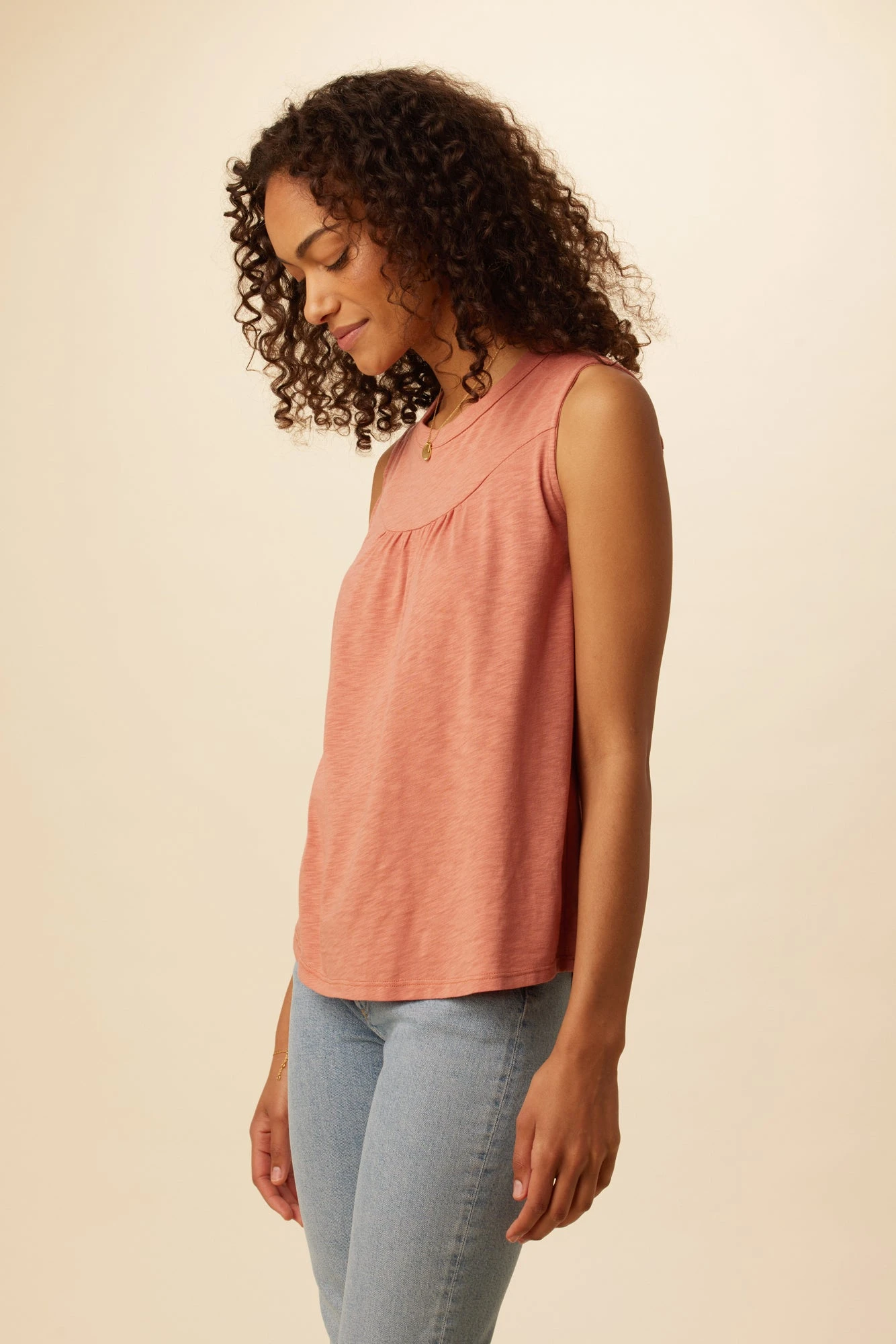 Sleeveless tank with a neckband, gathering in front, and relaxed silhouette. Made in our incredibly soft Reverie Slub fabric, a combination of Organic Cotton and Modal.