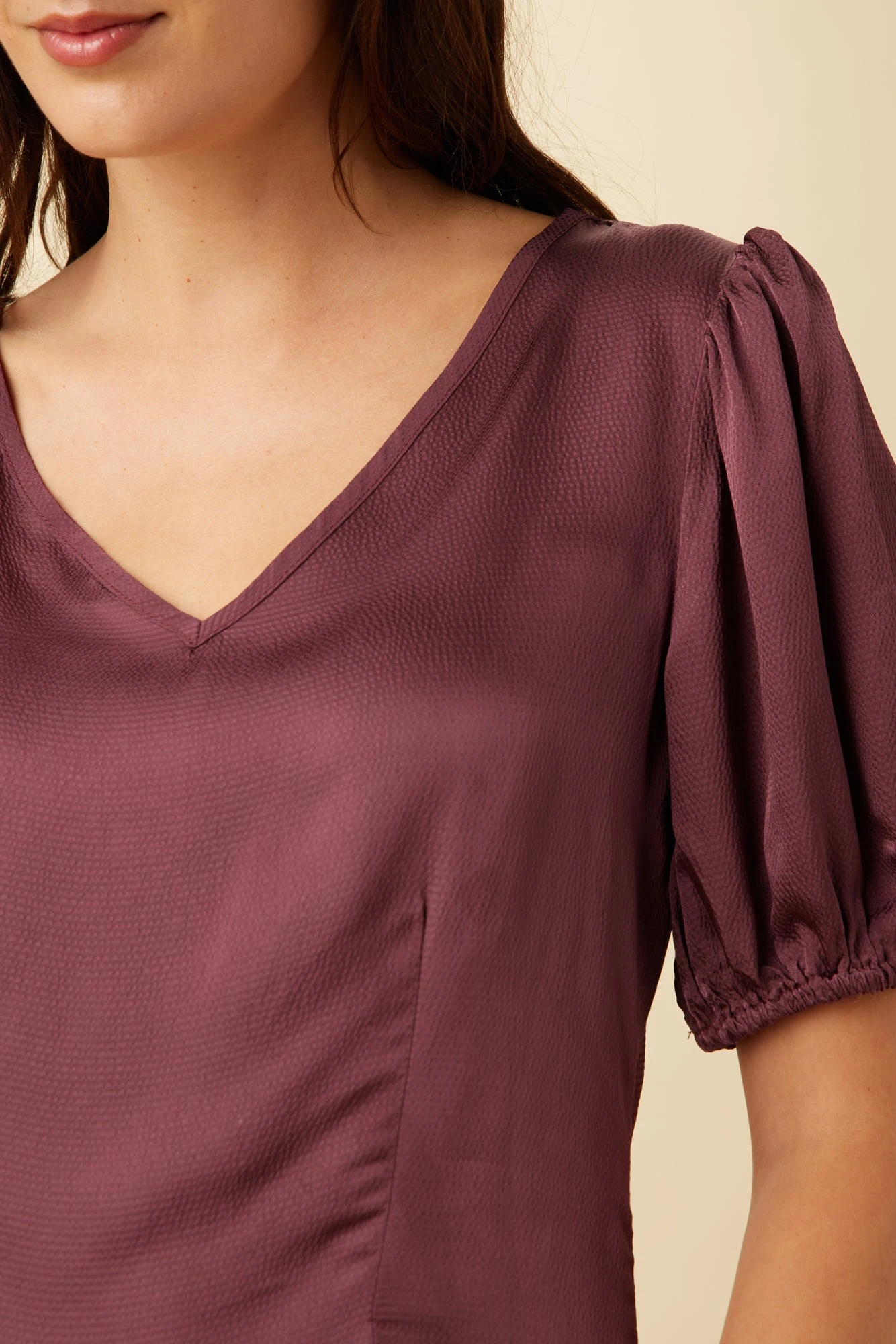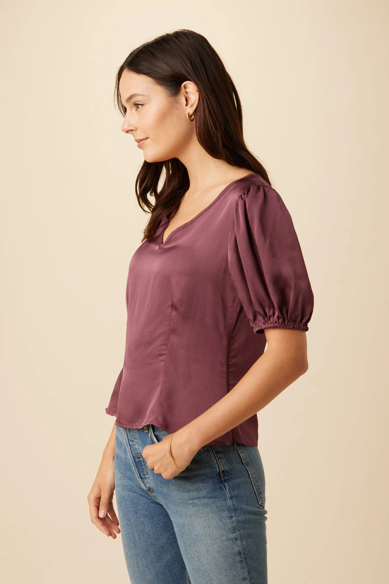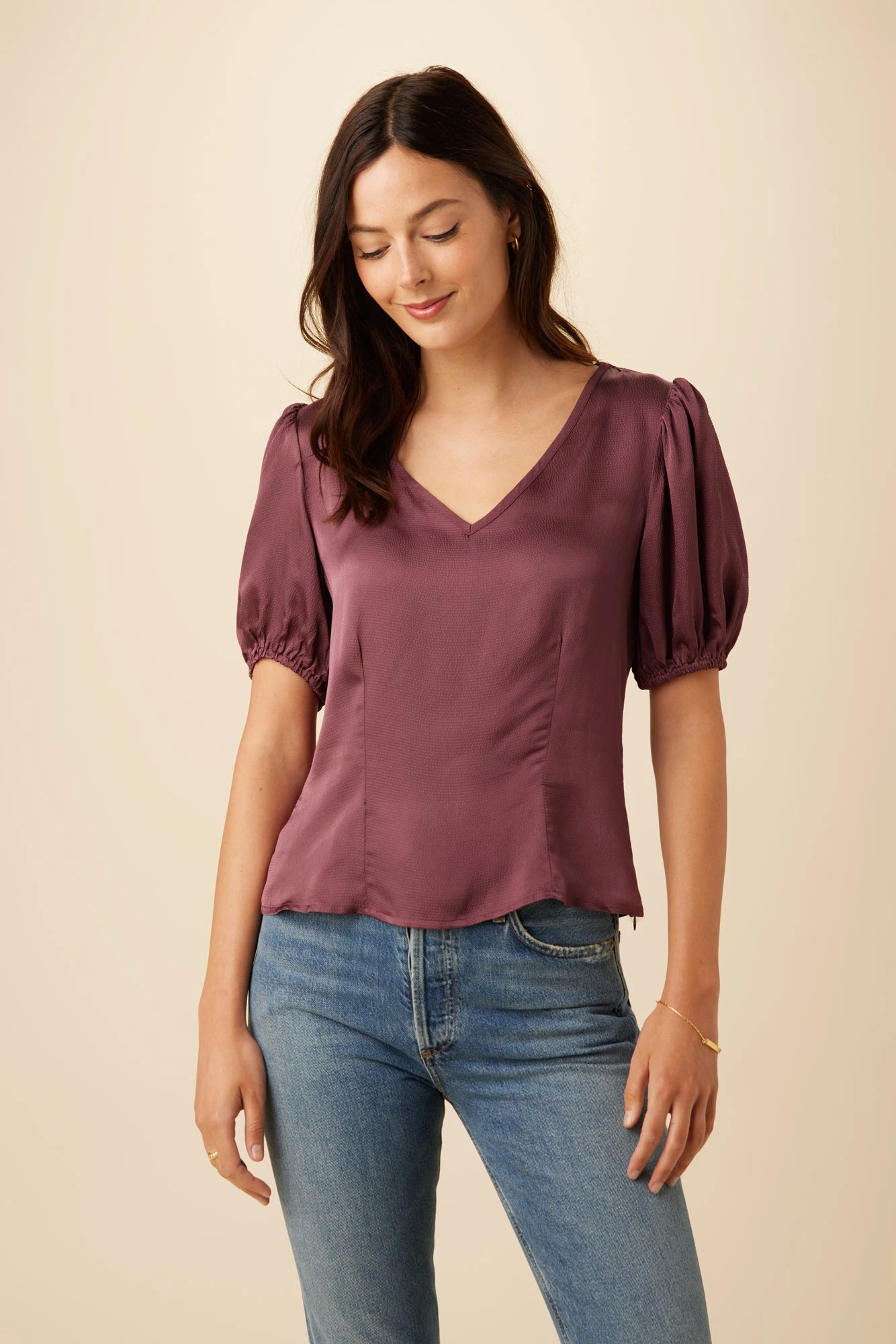 Slim fit, v-neck blouse featuring short puff sleeves and invisible side zipper, m