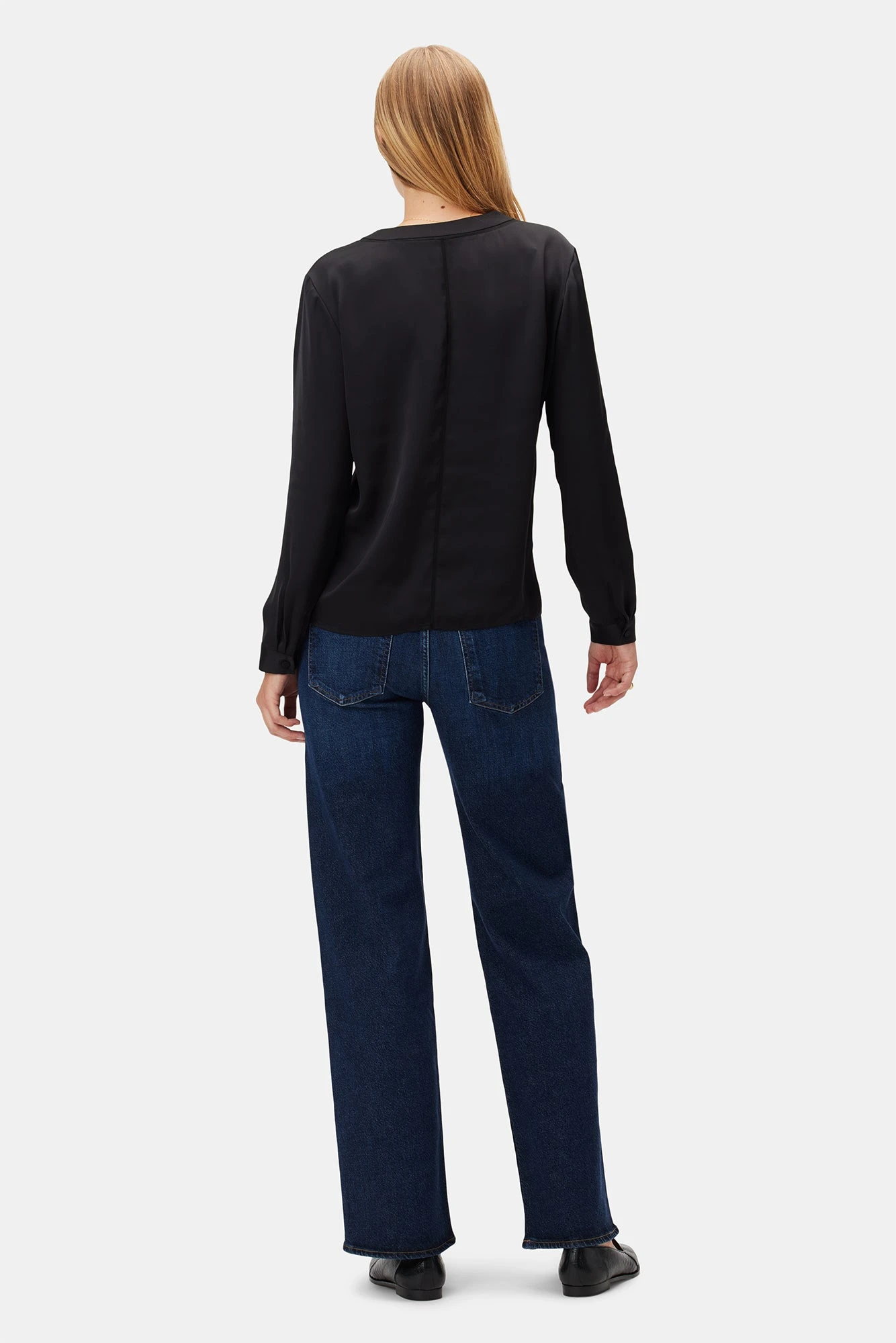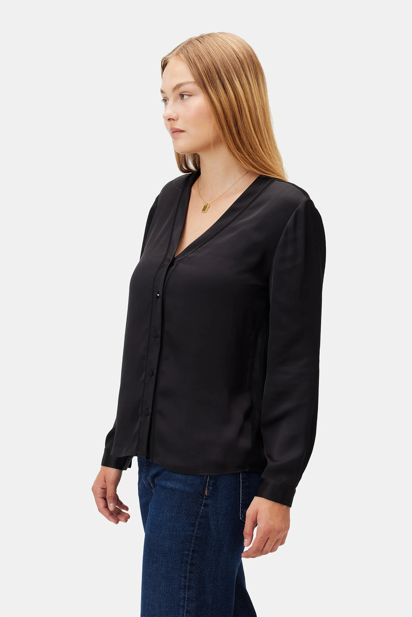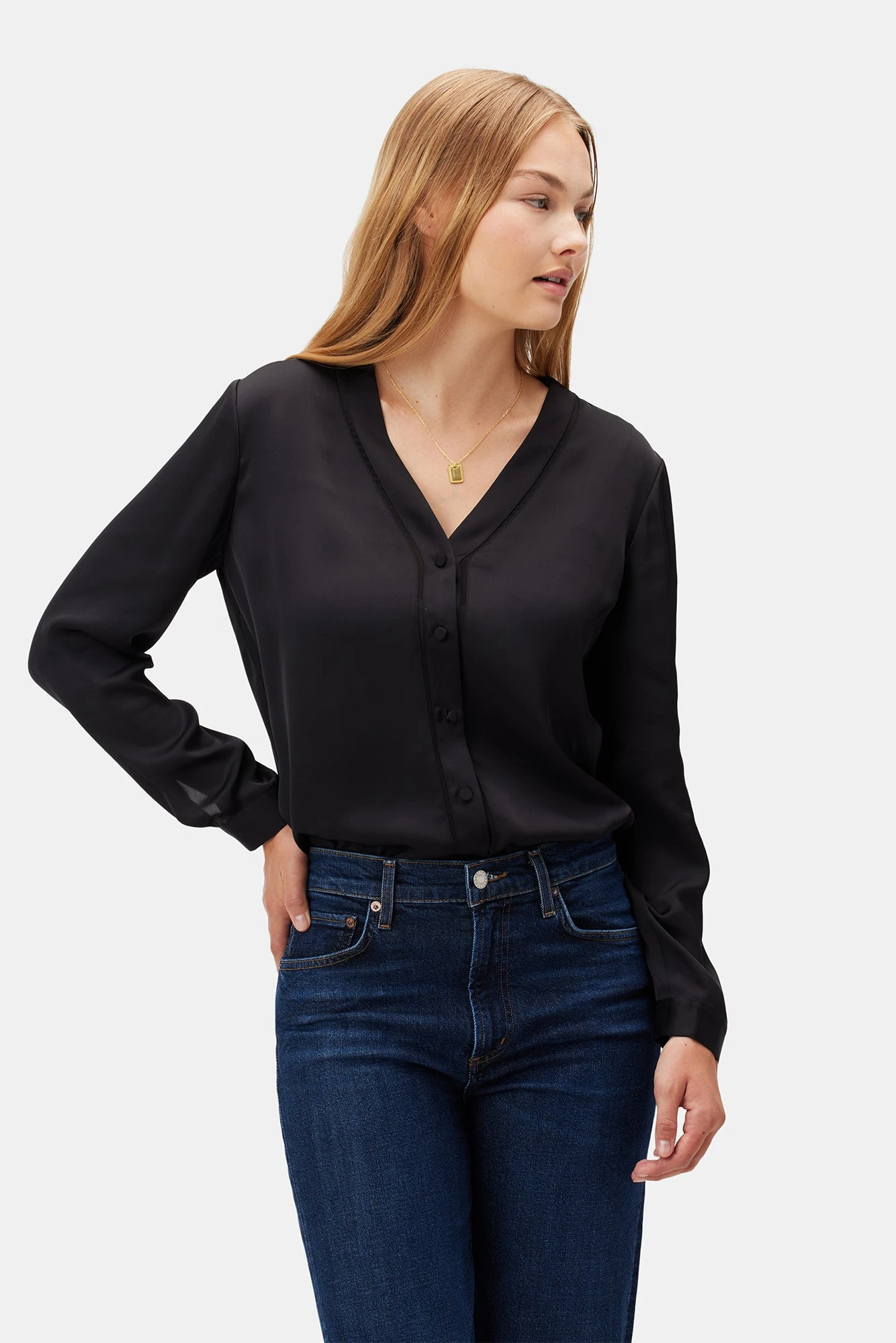 - One of our best selling styles, this long sleeve, slim fit v-neck blouse features front placket buttons and cuffed sleeves.