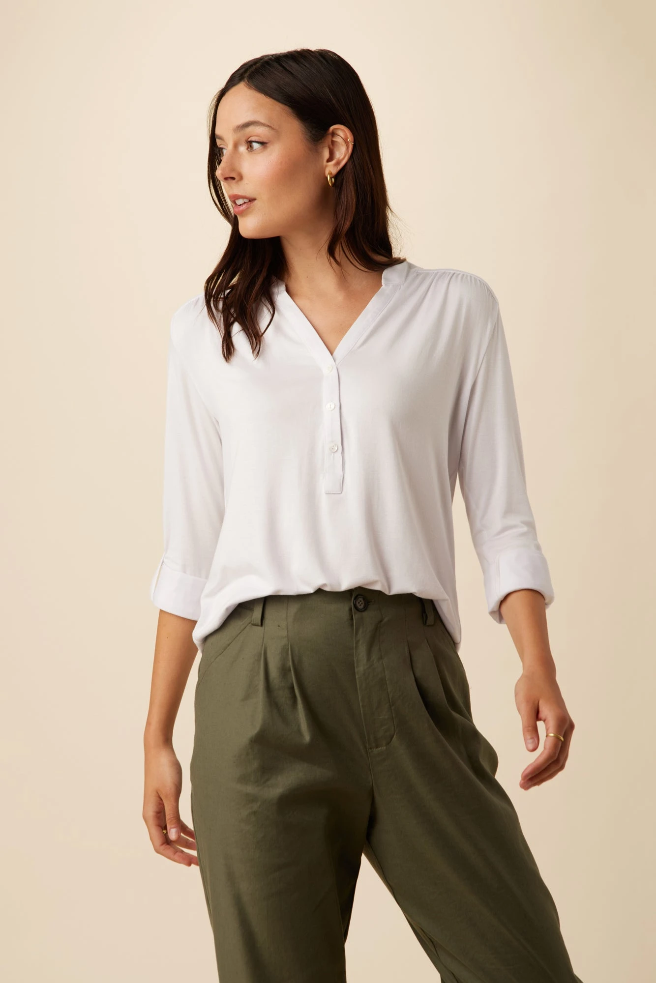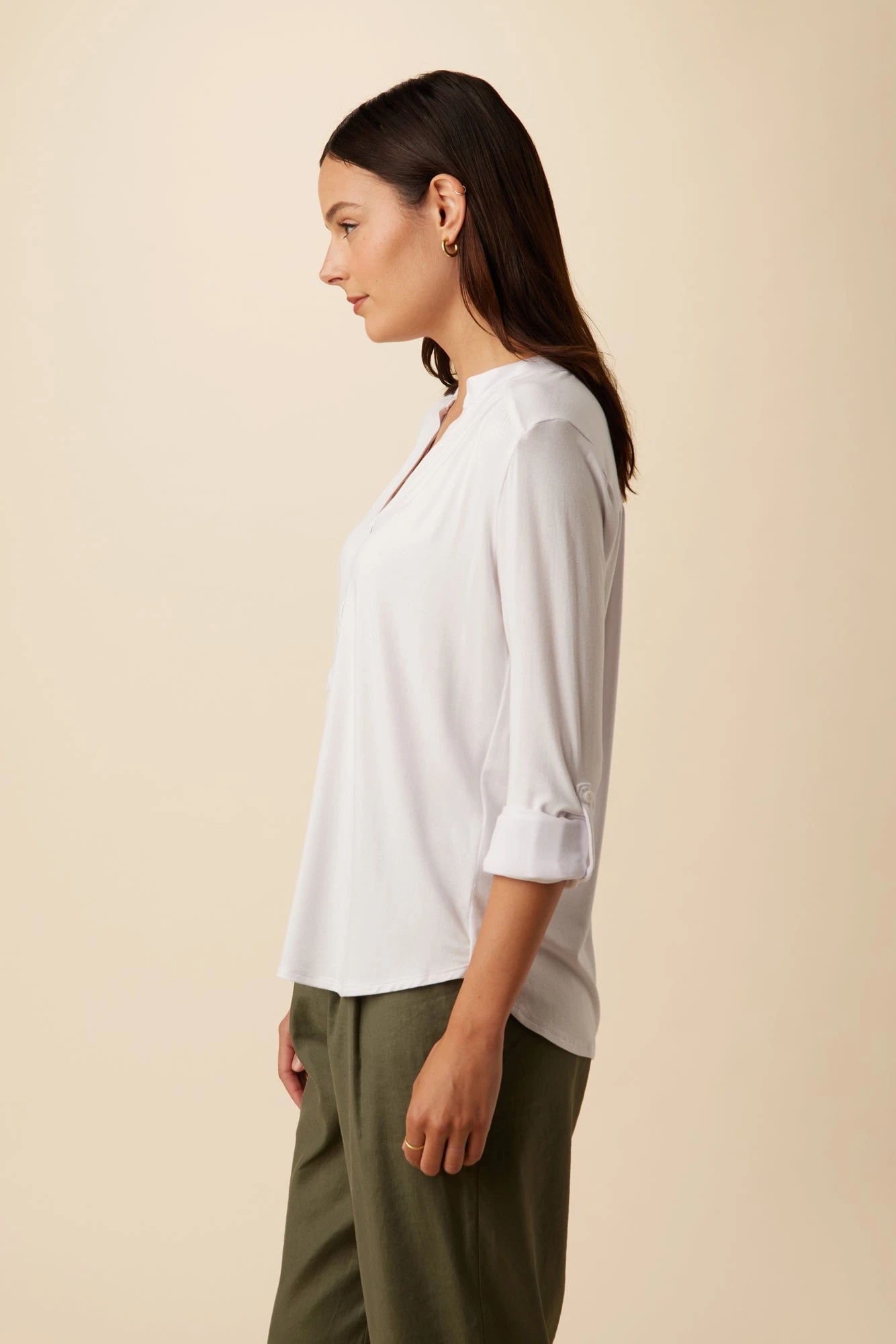 Long sleeve top featuring v-neckline, half placket and tab at sleeve to roll up and secure. Made from our signature Dream Knit, an unbelievably soft fabric made sustainably from beechwood fibers.