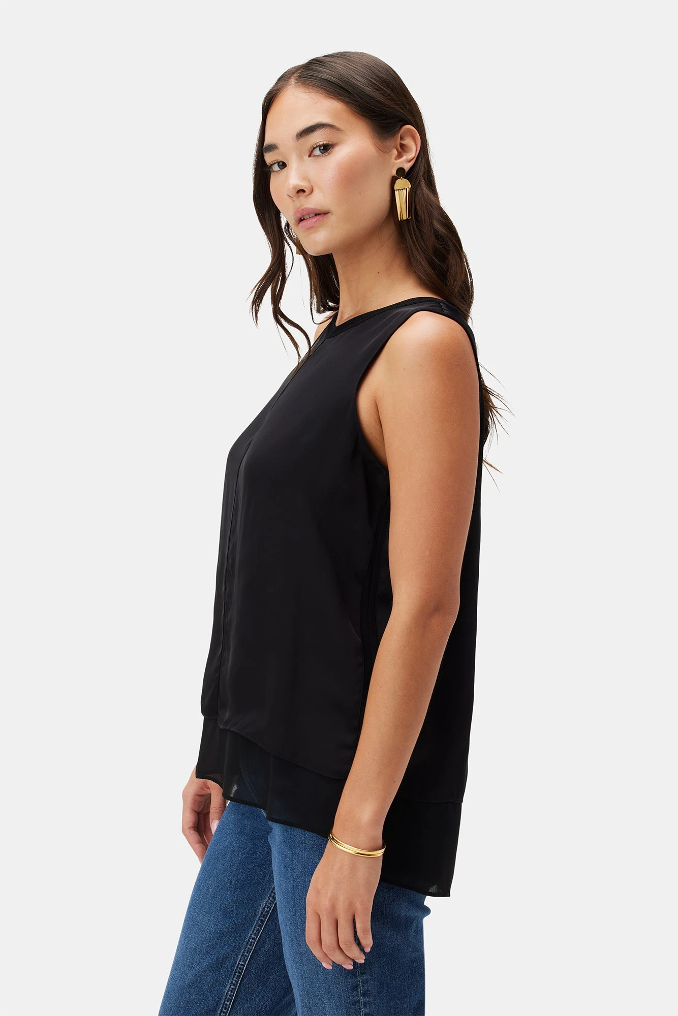 - Recycled polyester tank features chiffon lining, lined and rib trim at neck line.